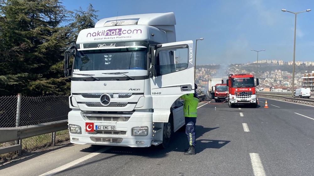 TIR’ı sağa çeken sürücü, araçtan indiği esnada lastikte yanma meydana geldi. Sürücü yangın tüpüyle alevlere müdahale etmeye çalışsa da başarılı olamadı.